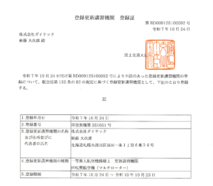 無人航空機の飛行に関し、国土交通省が、講習機関の運営、施設、設備、講師、学科講習及び実地講習の内容などが航空法等の法令の要件に適合しているかの審査を行った結果、要件に適合しているとして国土交通省より登録証の交付を受けた機関です。当該登録講習機関において所定の講習課程を修了した者については、無人航空機の一等操縦士及び二等操縦士の国家資格試験のうち、実地試験の全部が免除されます。