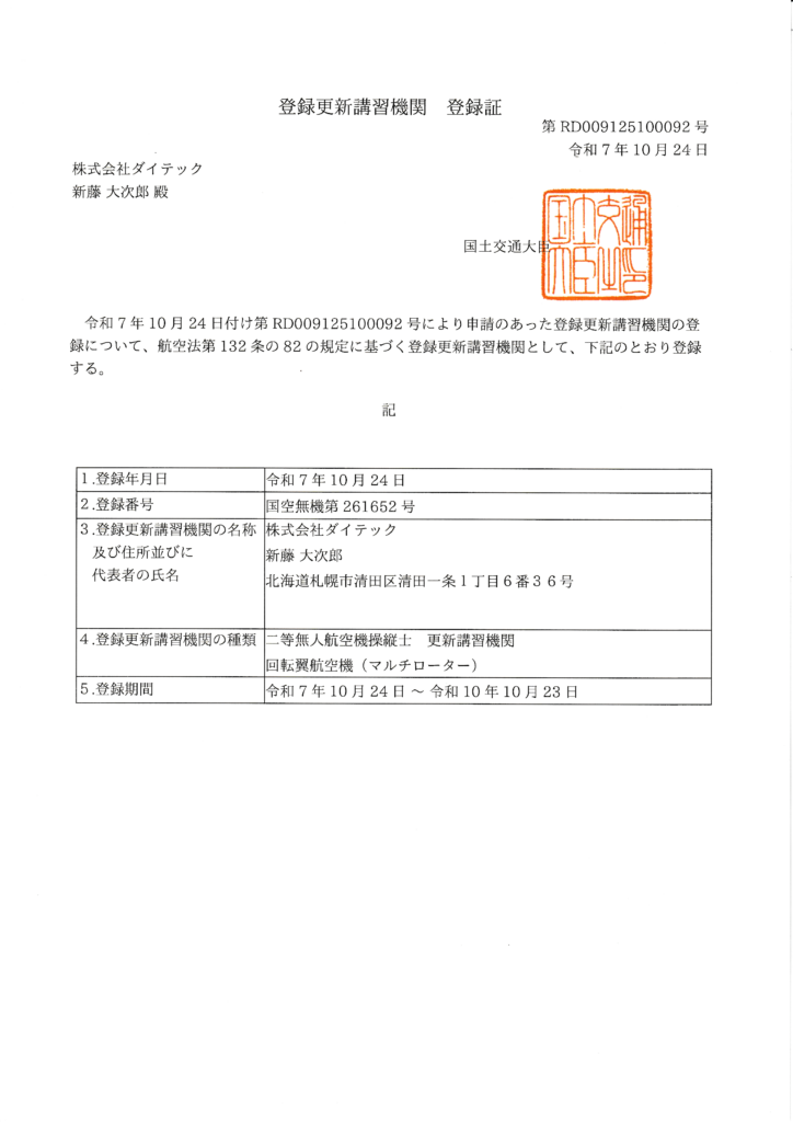 2025年10月24日、技能証明の更新講習を行うことができる登録更新講習機関として国土交通省航空局に登録されました。